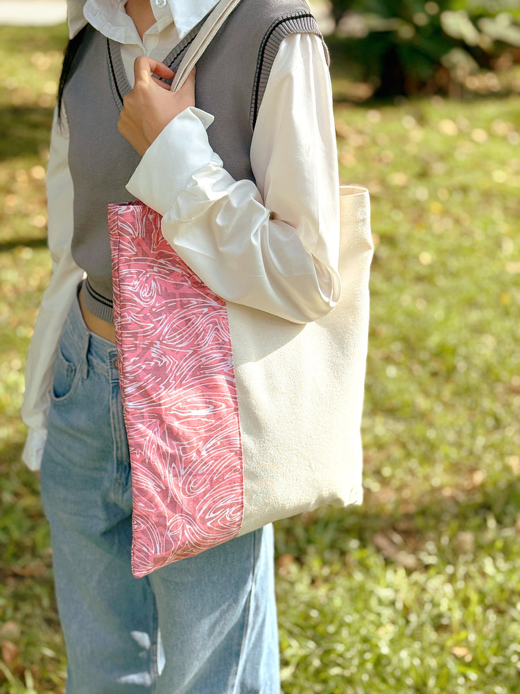 This canvas tote bag features a unique hand-stamped batik panel alongside sturdy natural canvas, blending artisanal craft with everyday function. Spacious, lightweight, and durable — it’s made to carry you from market mornings to coffee dates to workdays with ease.