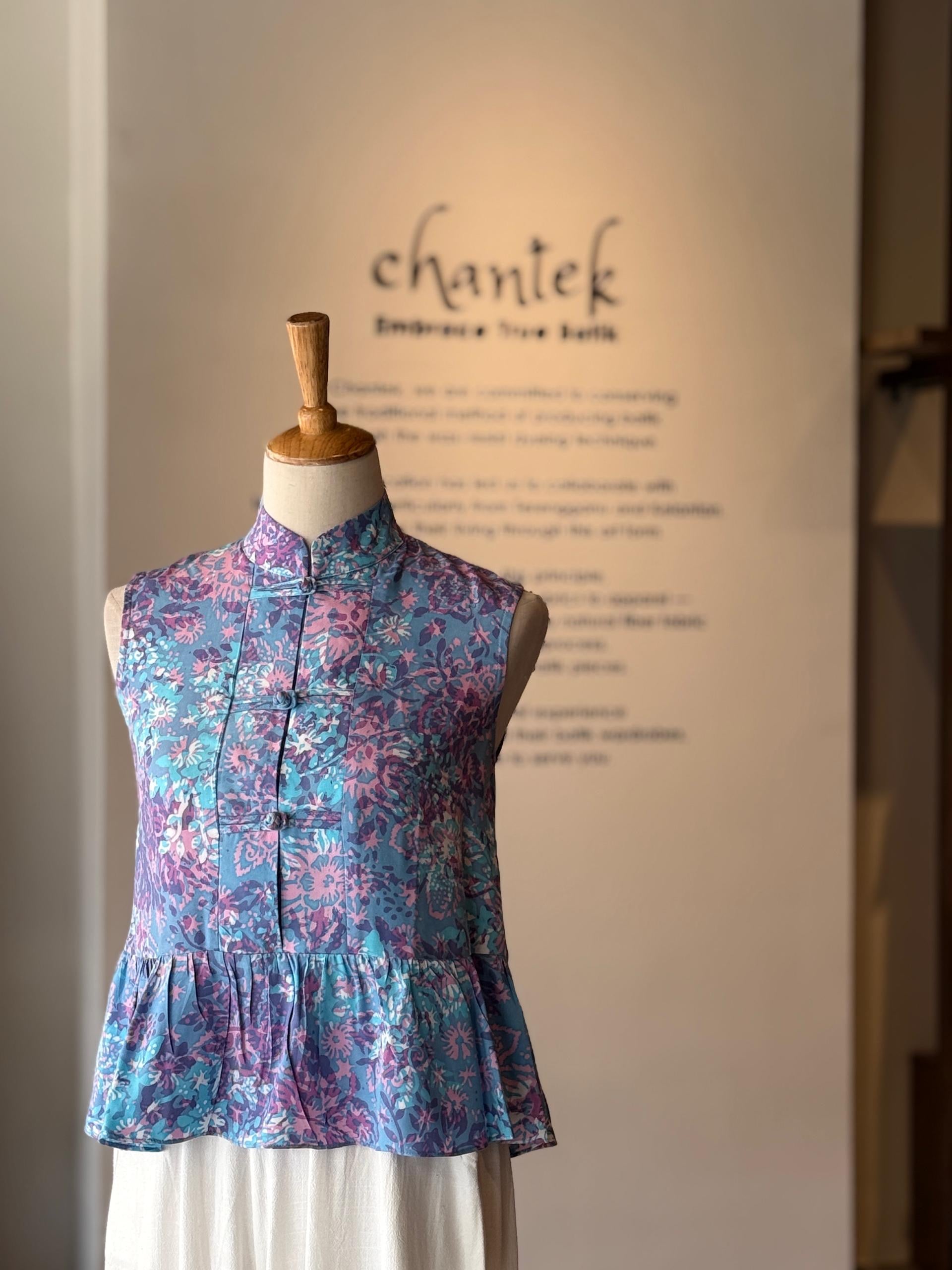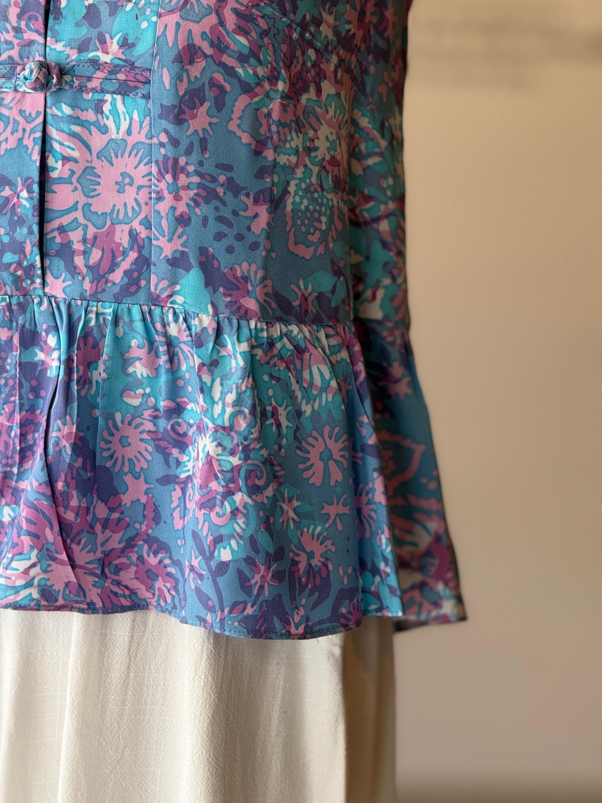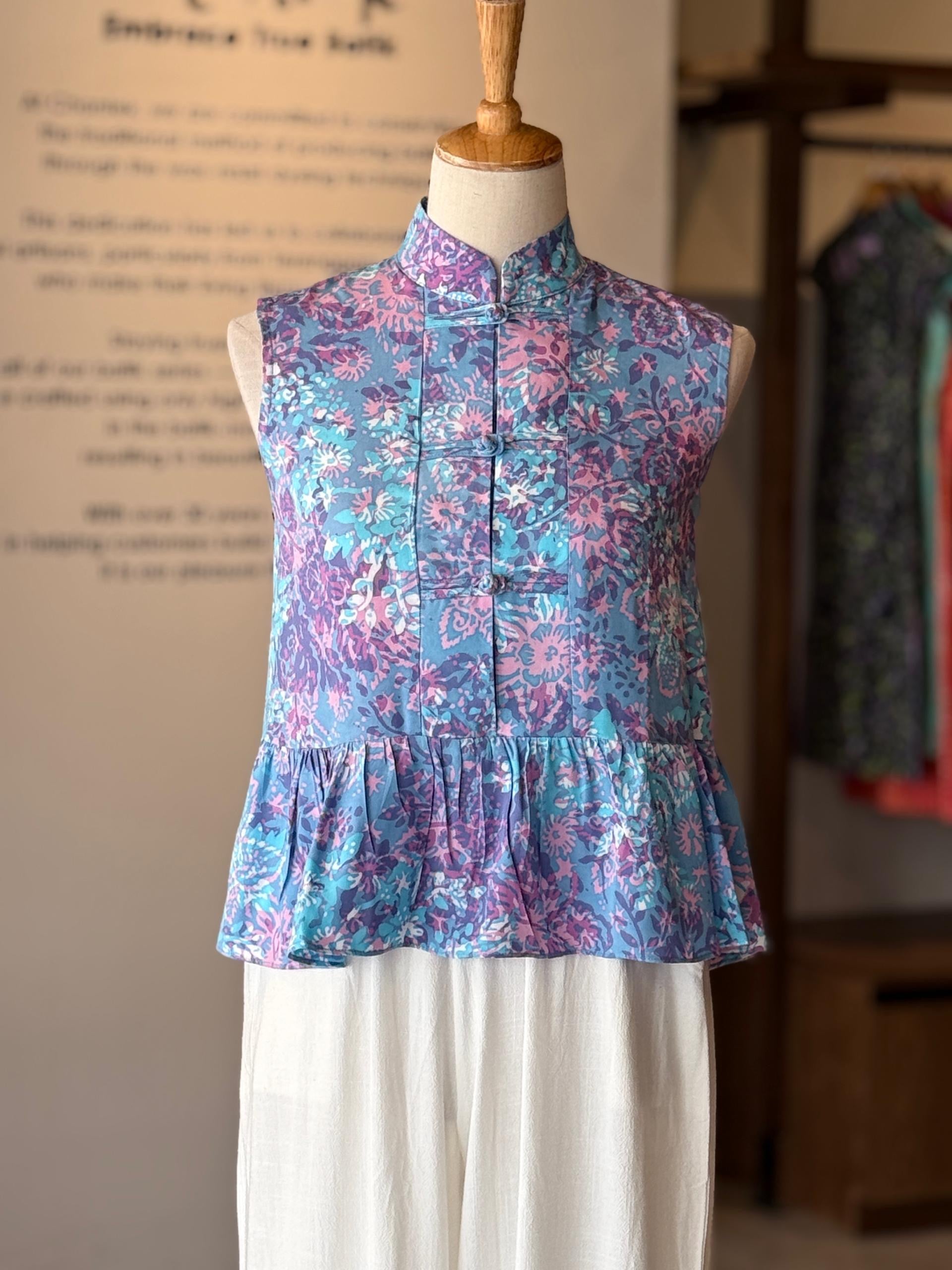 Featuring a classic Chinese collar and a handmade traditional button knot at the center, the Aura Qipao Top celebrates artisanal craftsmanship in every stitch. The frilled waist detail adds a touch of feminine charm, while the sleeveless cut keeps it chic and versatile for any occasion.