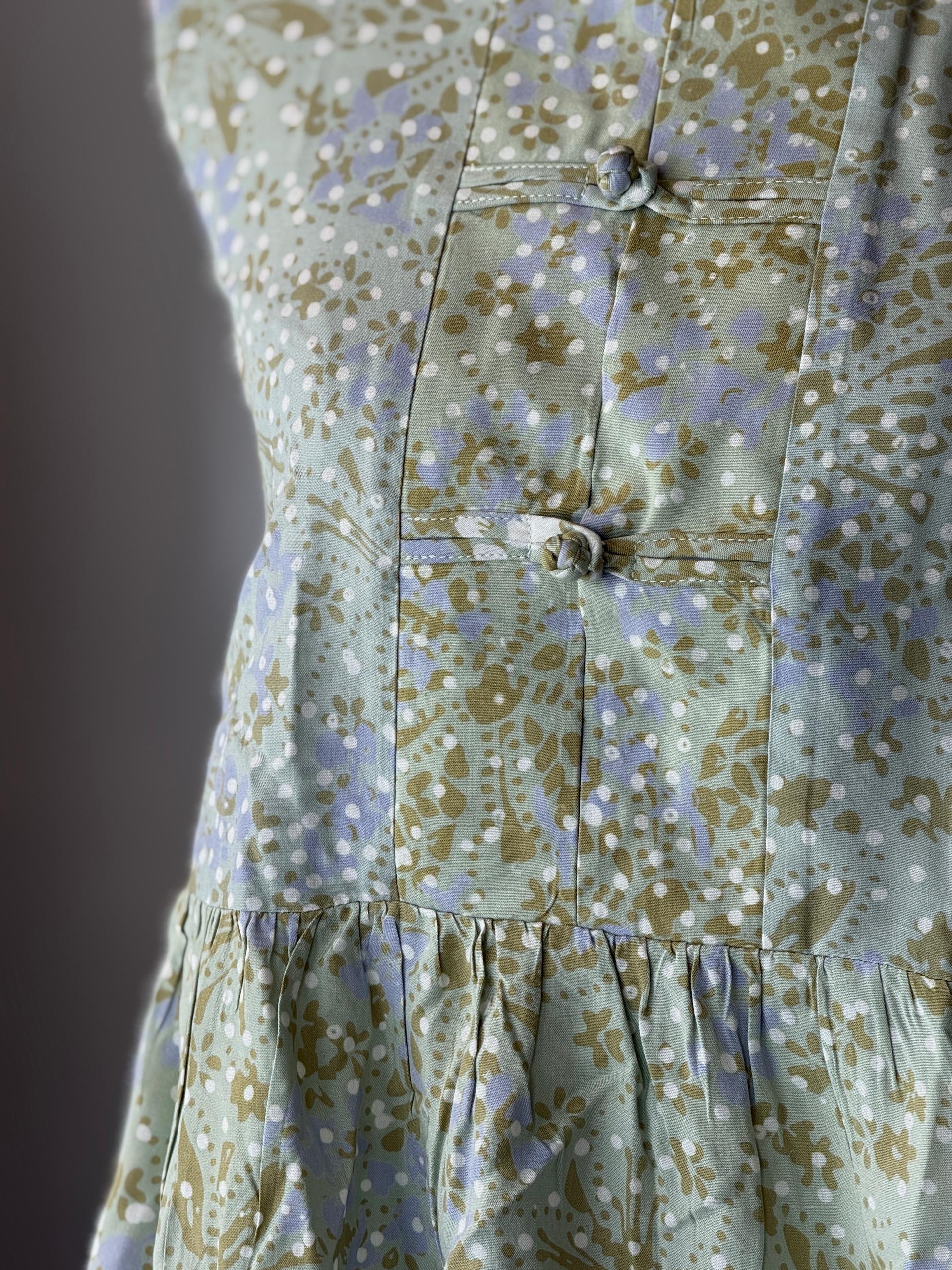 Featuring a classic Chinese collar and a handmade traditional button knot at the center, the Aura Qipao Top celebrates artisanal craftsmanship in every stitch. The frilled waist detail adds a touch of feminine charm, while the sleeveless cut keeps it chic and versatile for any occasion.