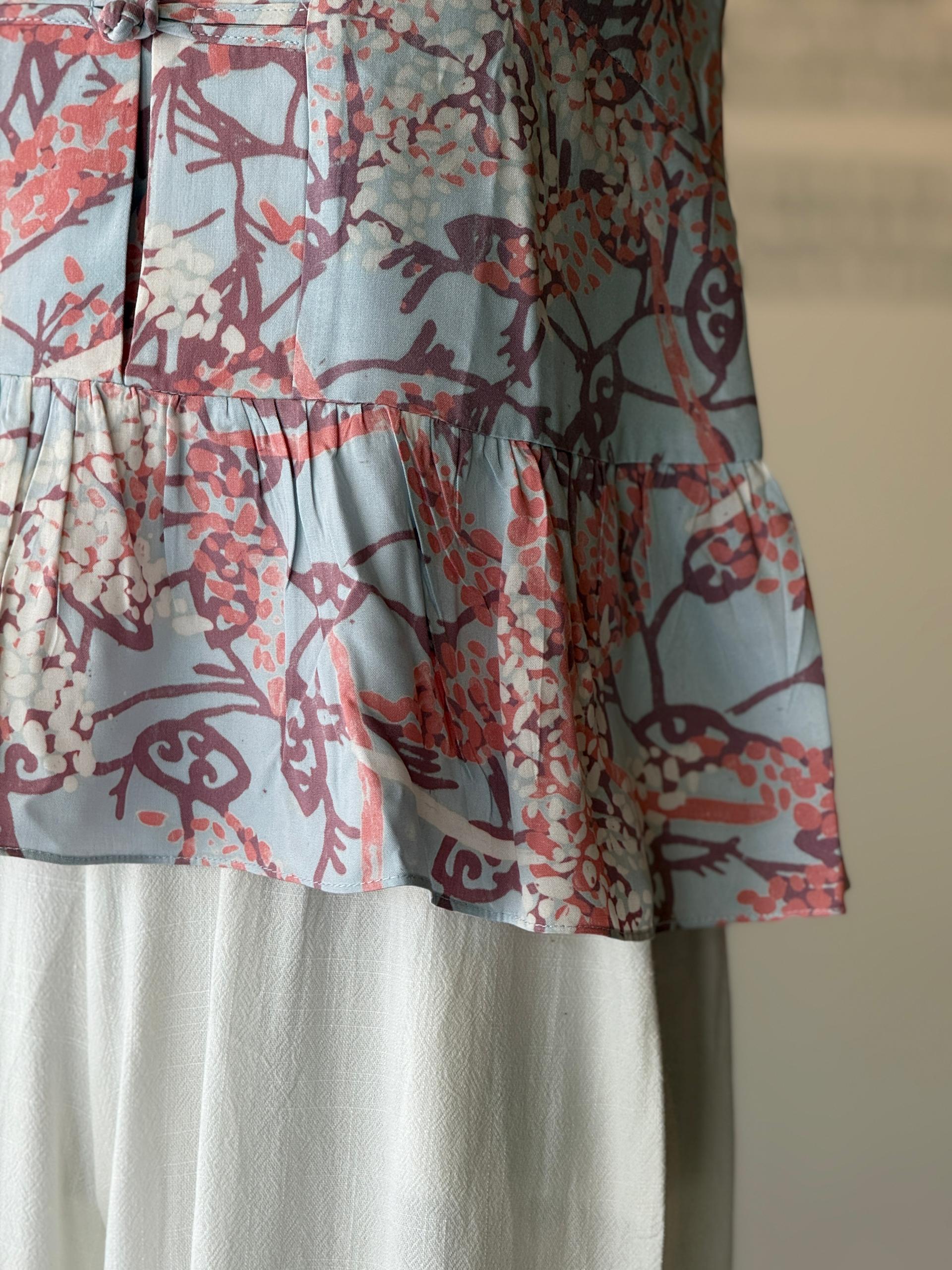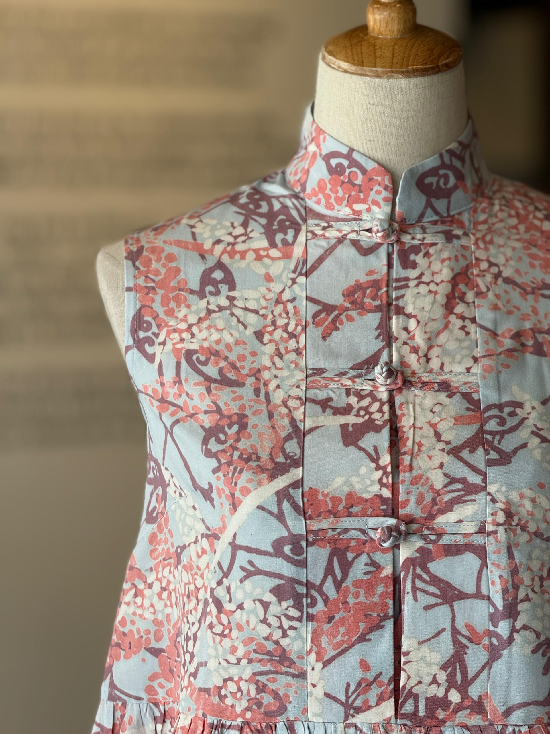 Featuring a classic Chinese collar and a handmade traditional button knot at the center, the Aura Qipao Top celebrates artisanal craftsmanship in every stitch. The frilled waist detail adds a touch of feminine charm, while the sleeveless cut keeps it chic and versatile for any occasion.