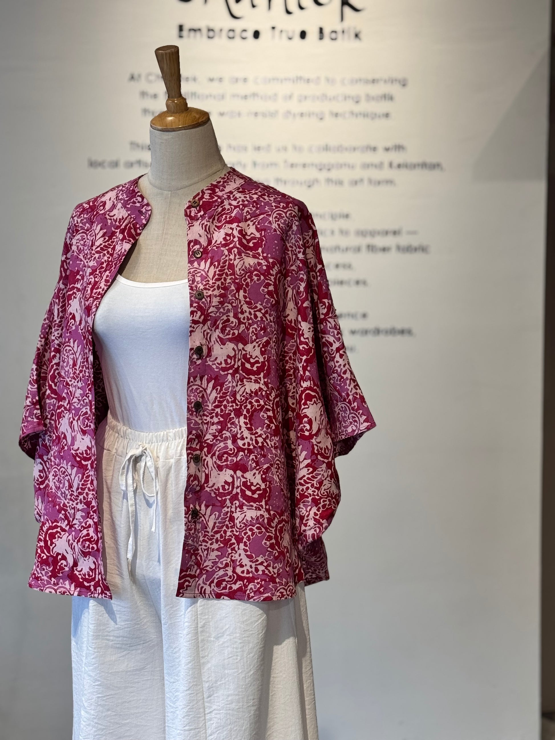 A cardigan shirt made from Kelantan handmade batik is a versatile piece that can be worn in multiple stylish ways.