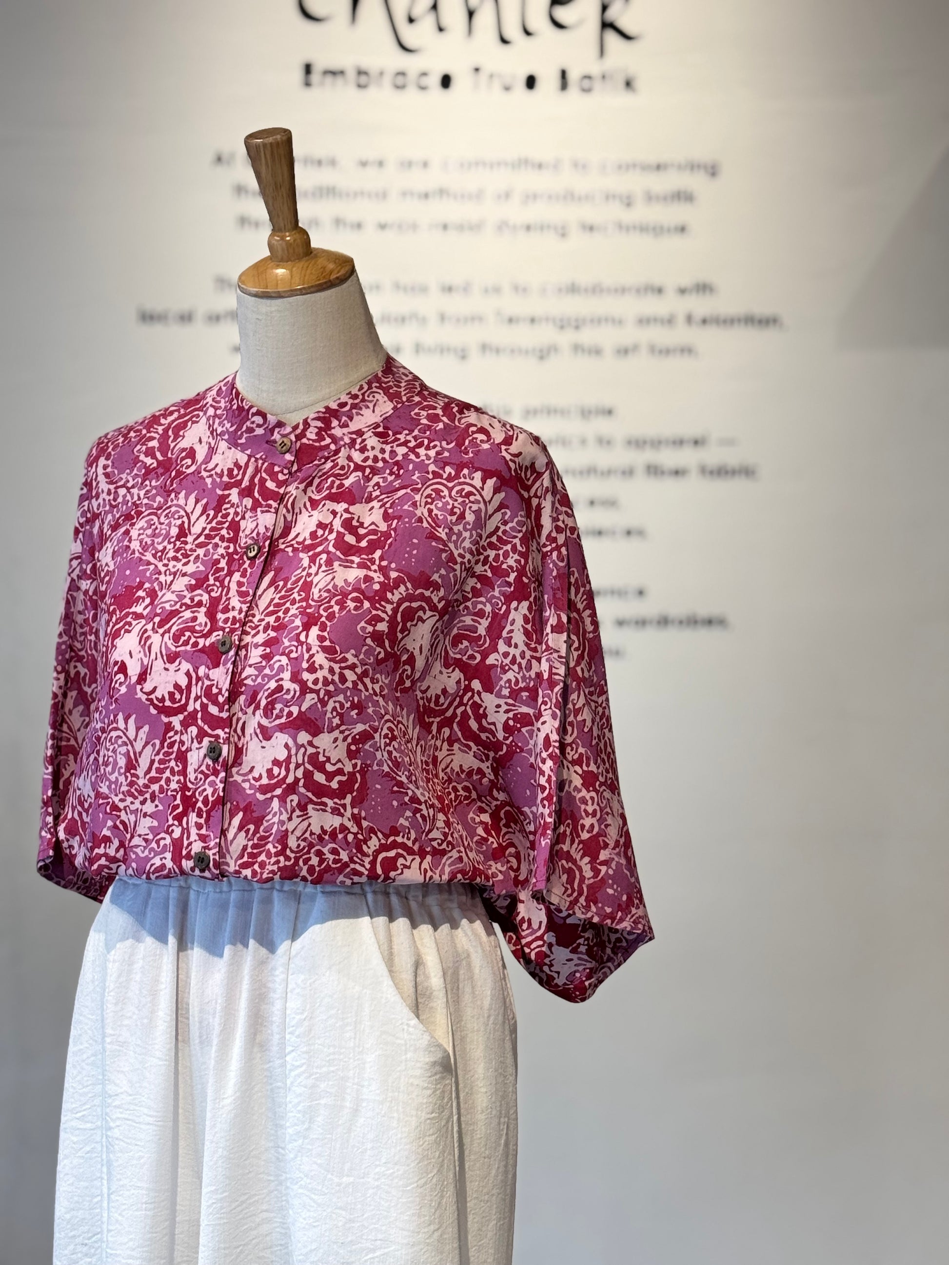 The shirt features a button-down front with delicate buttons that complement the rich hues and designs of the batik. The fabric itself is lightweight yet durable, making it perfect for various seasons and occasions.
