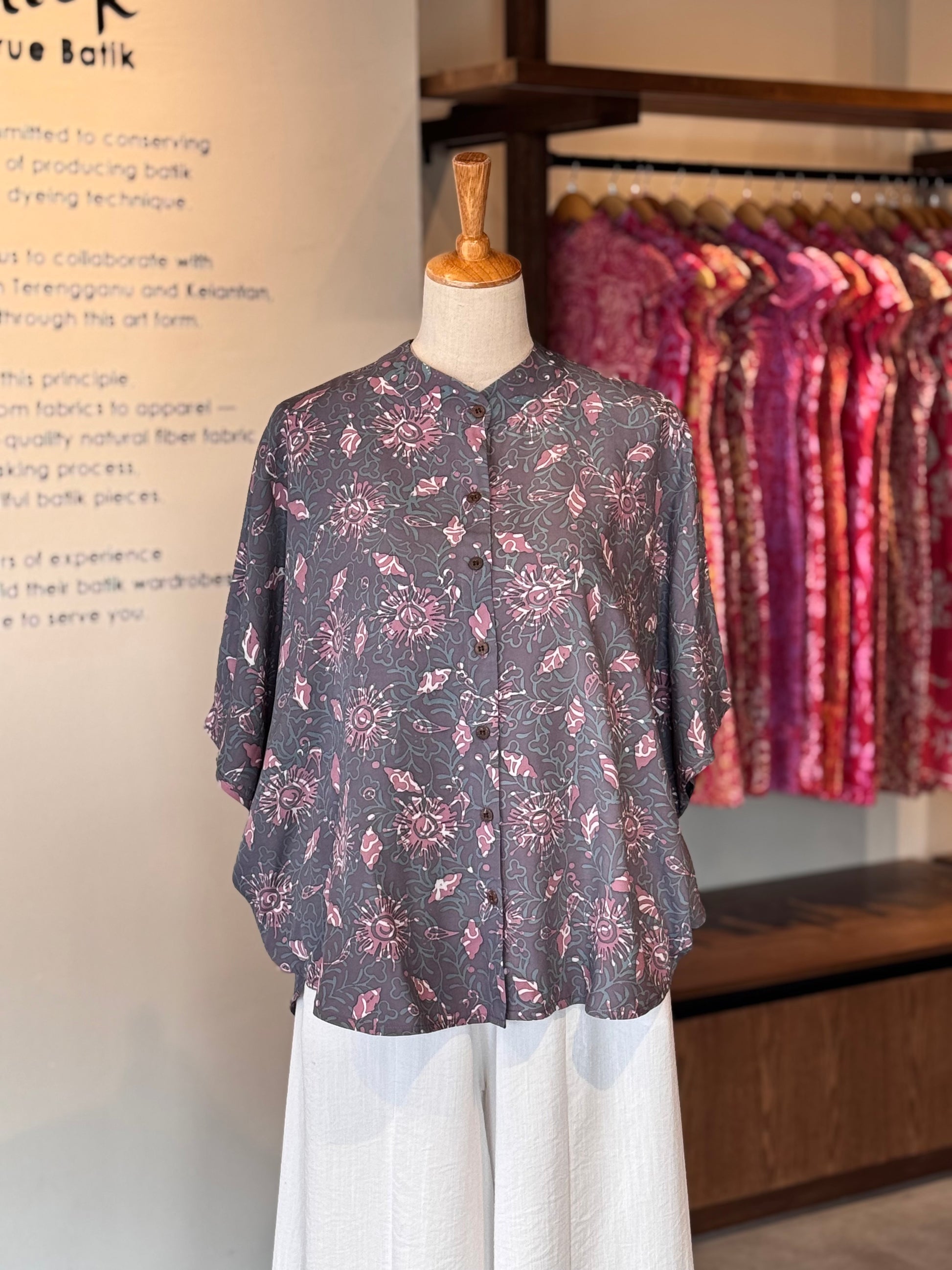 When worn as a shirt, it drapes elegantly, showcasing the unique motifs of Kelantanese batik. The collar adds a touch of sophistication, whether worn buttoned up for a formal look or casually open for a relaxed vibe.