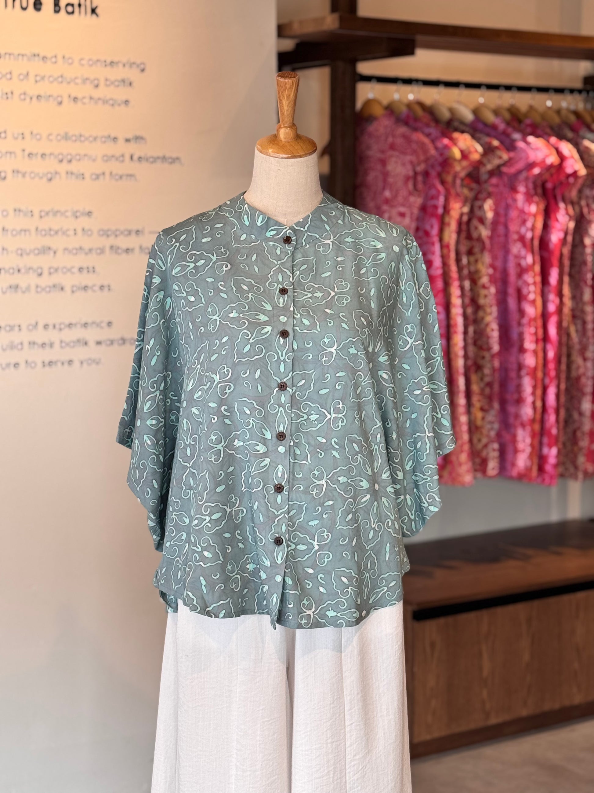 When worn as a shirt, it drapes elegantly, showcasing the unique motifs of Kelantanese batik. The collar adds a touch of sophistication, whether worn buttoned up for a formal look or casually open for a relaxed vibe.