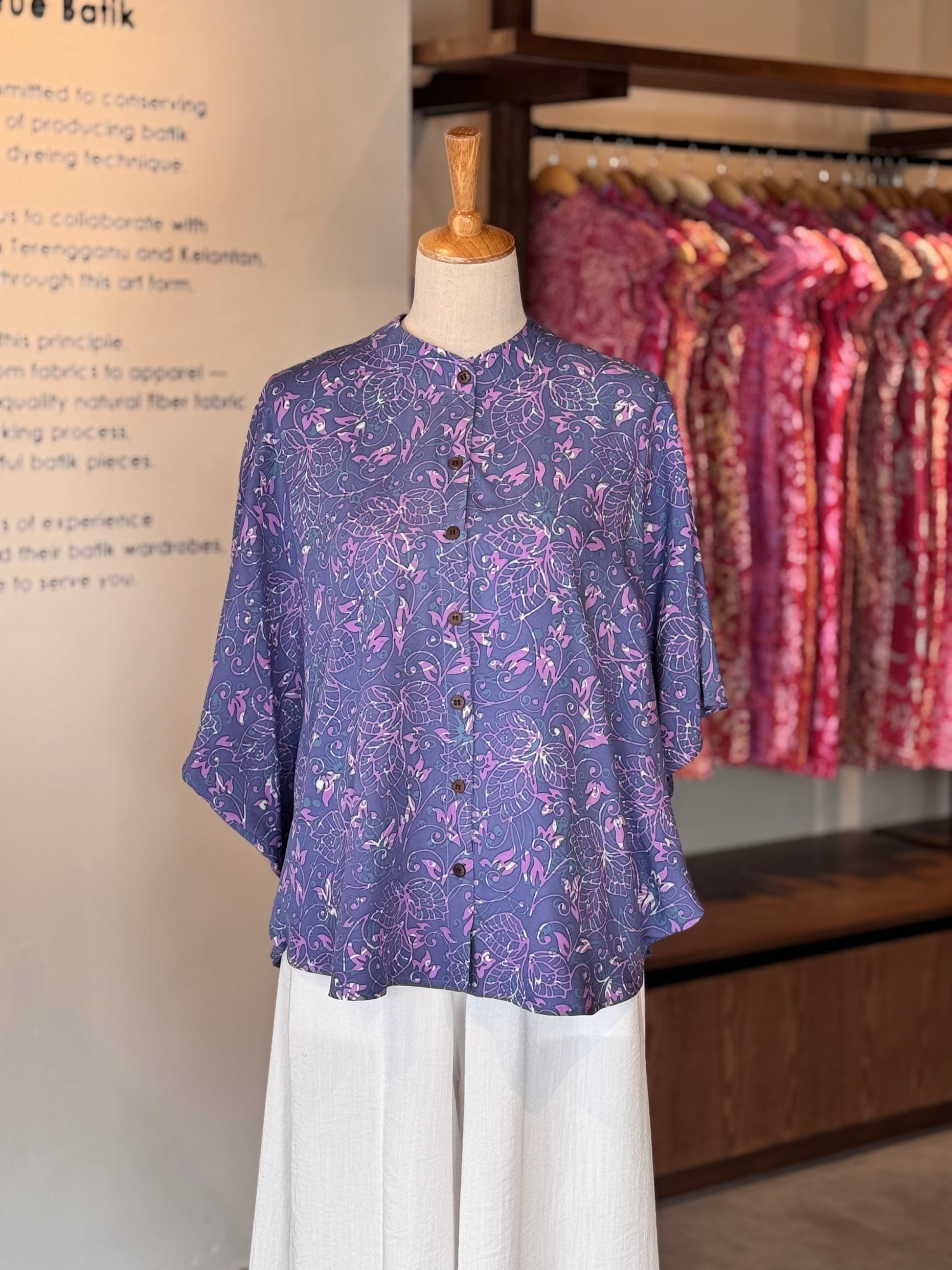 When worn as a shirt, it drapes elegantly, showcasing the unique motifs of Kelantanese batik. The collar adds a touch of sophistication, whether worn buttoned up for a formal look or casually open for a relaxed vibe.