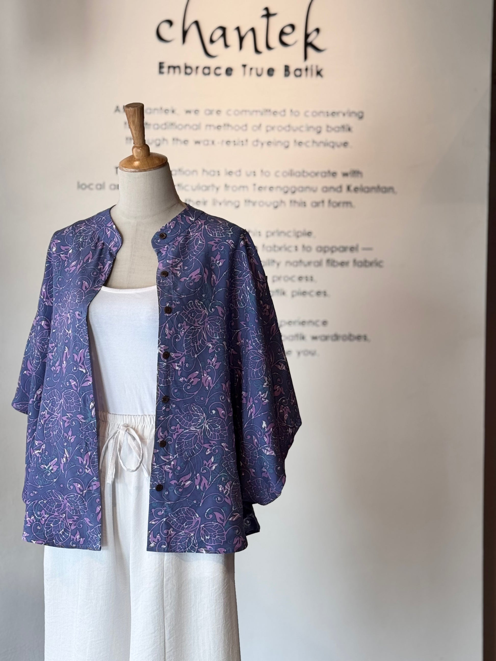 A cardigan shirt made from Kelantan handmade batik is a versatile piece that can be worn in multiple stylish ways.