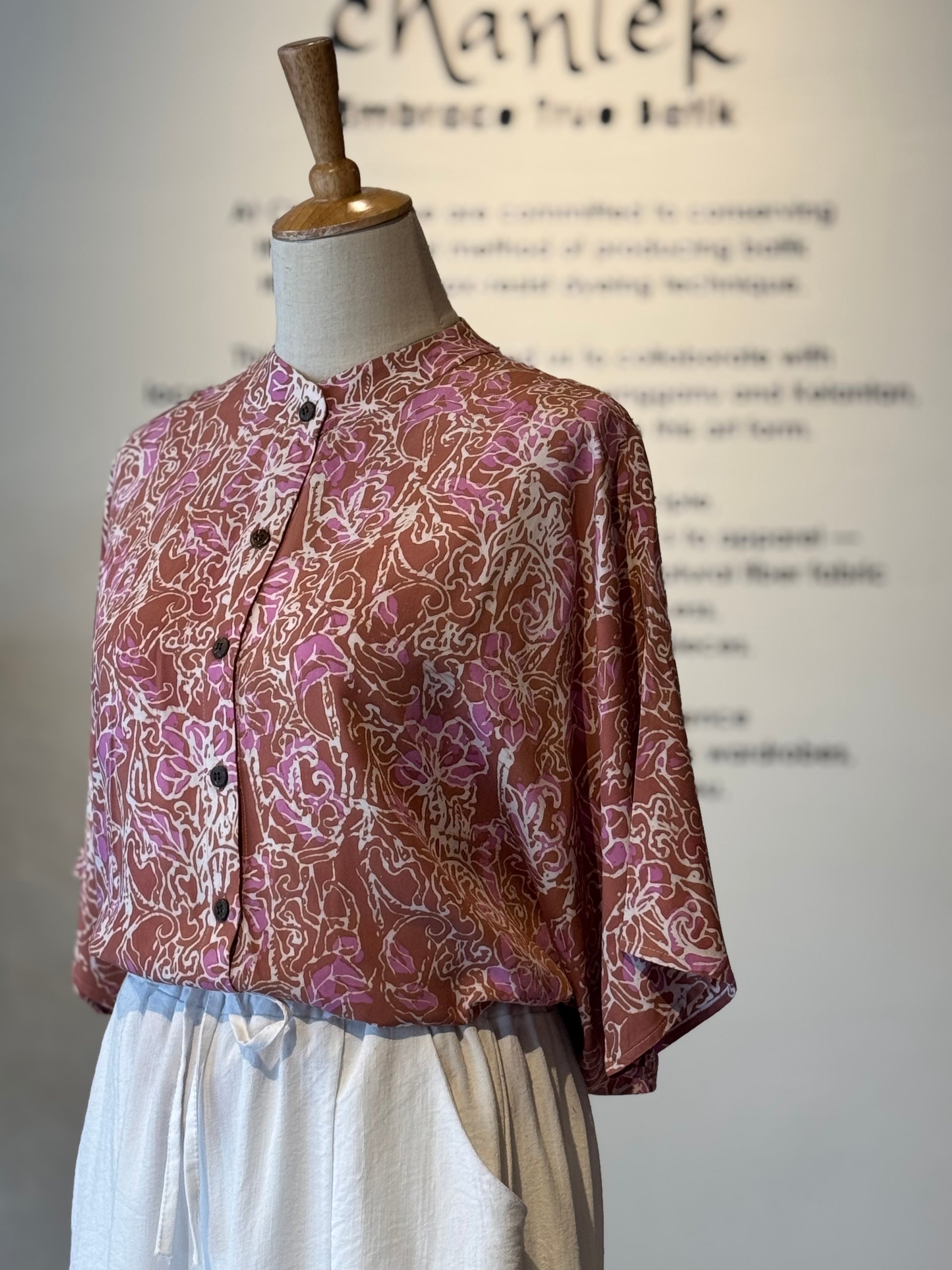 The shirt features a button-down front with delicate buttons that complement the rich hues and designs of the batik. The fabric itself is lightweight yet durable, making it perfect for various seasons and occasions.