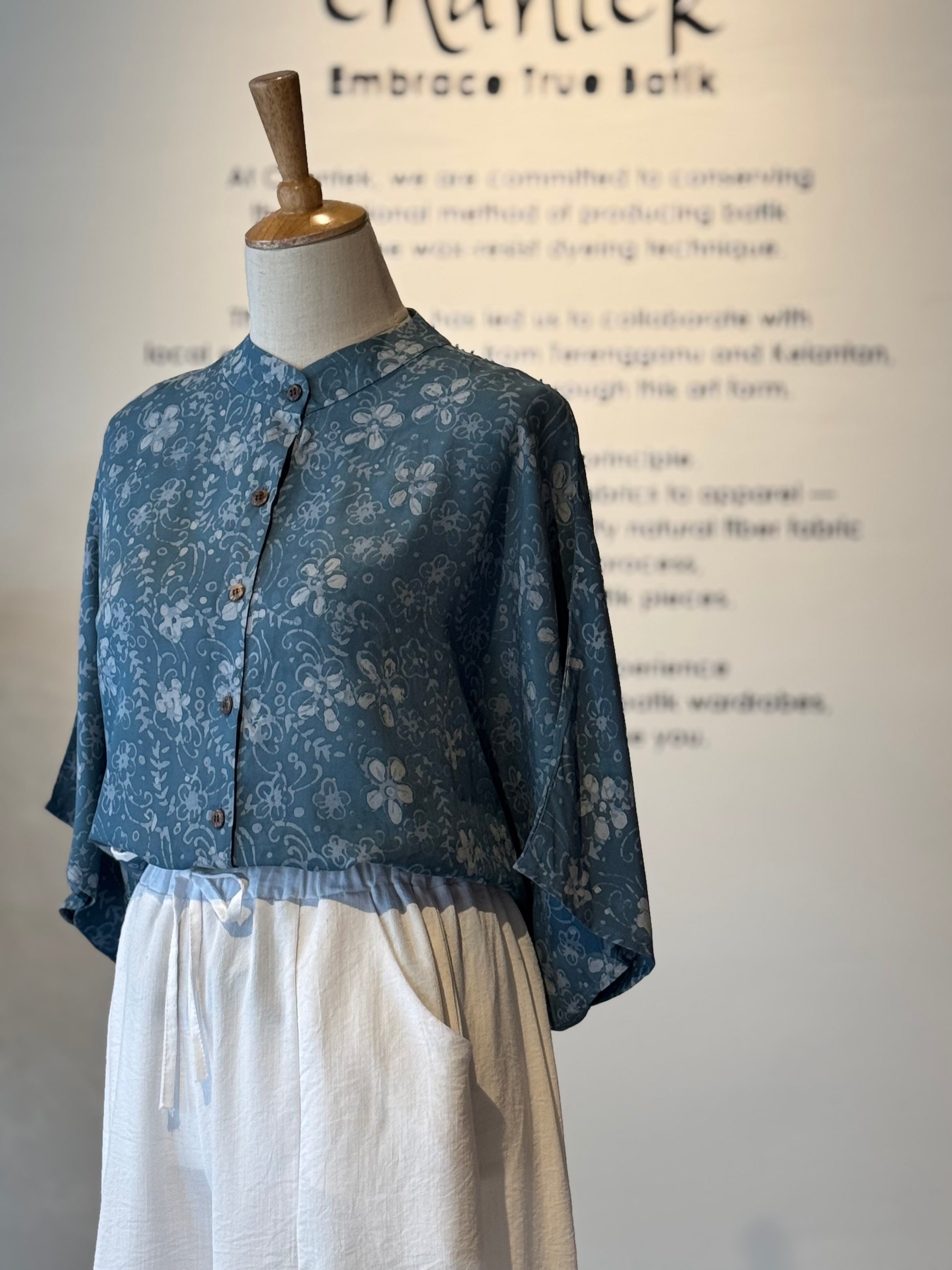When worn as a shirt, it drapes elegantly, showcasing the unique motifs of Kelantanese batik. The collar adds a touch of sophistication, whether worn buttoned up for a formal look or casually open for a relaxed vibe.