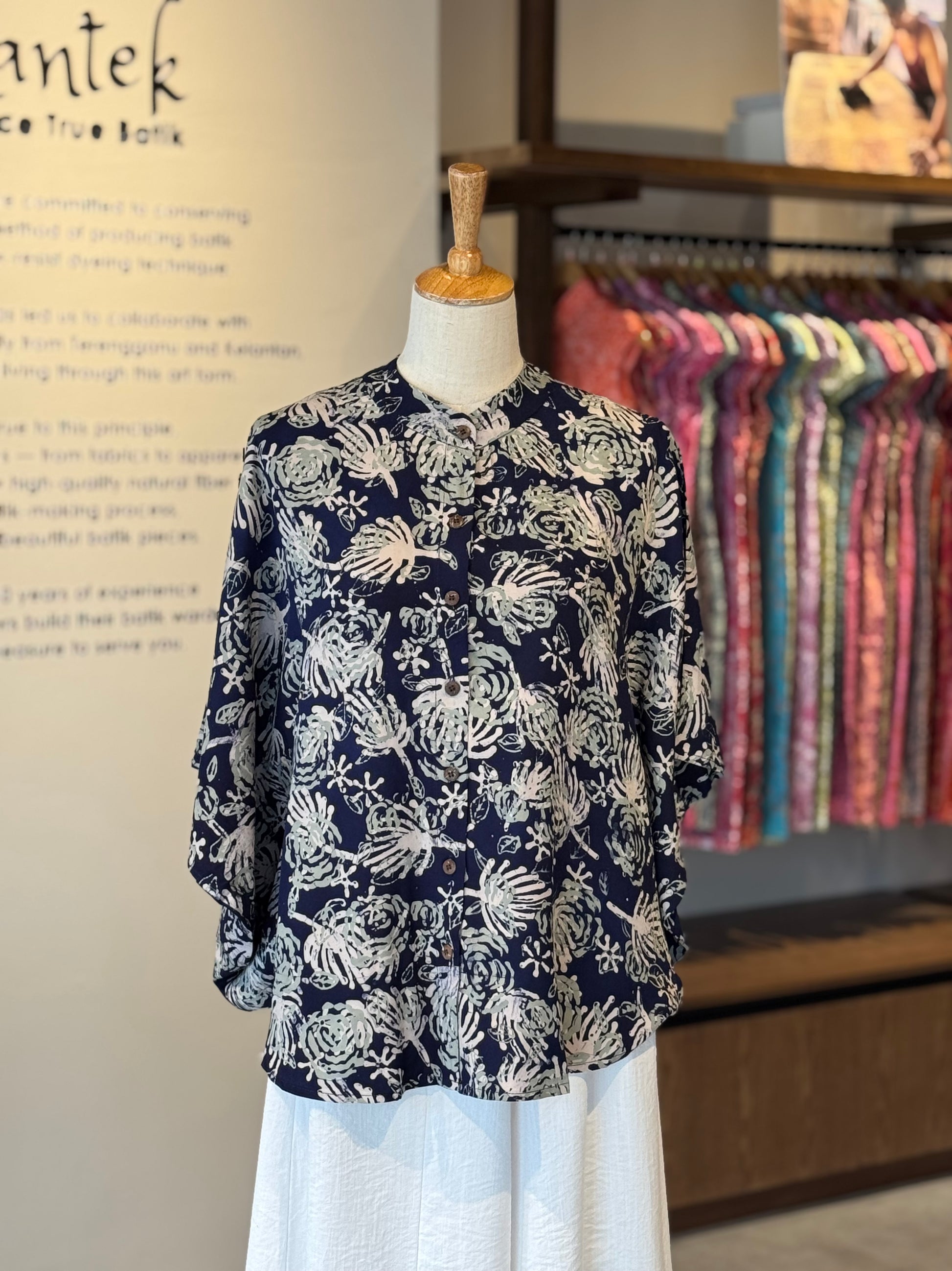 The shirt features a button-down front with delicate buttons that complement the rich hues and designs of the batik. The fabric itself is lightweight yet durable, making it perfect for various seasons and occasions.