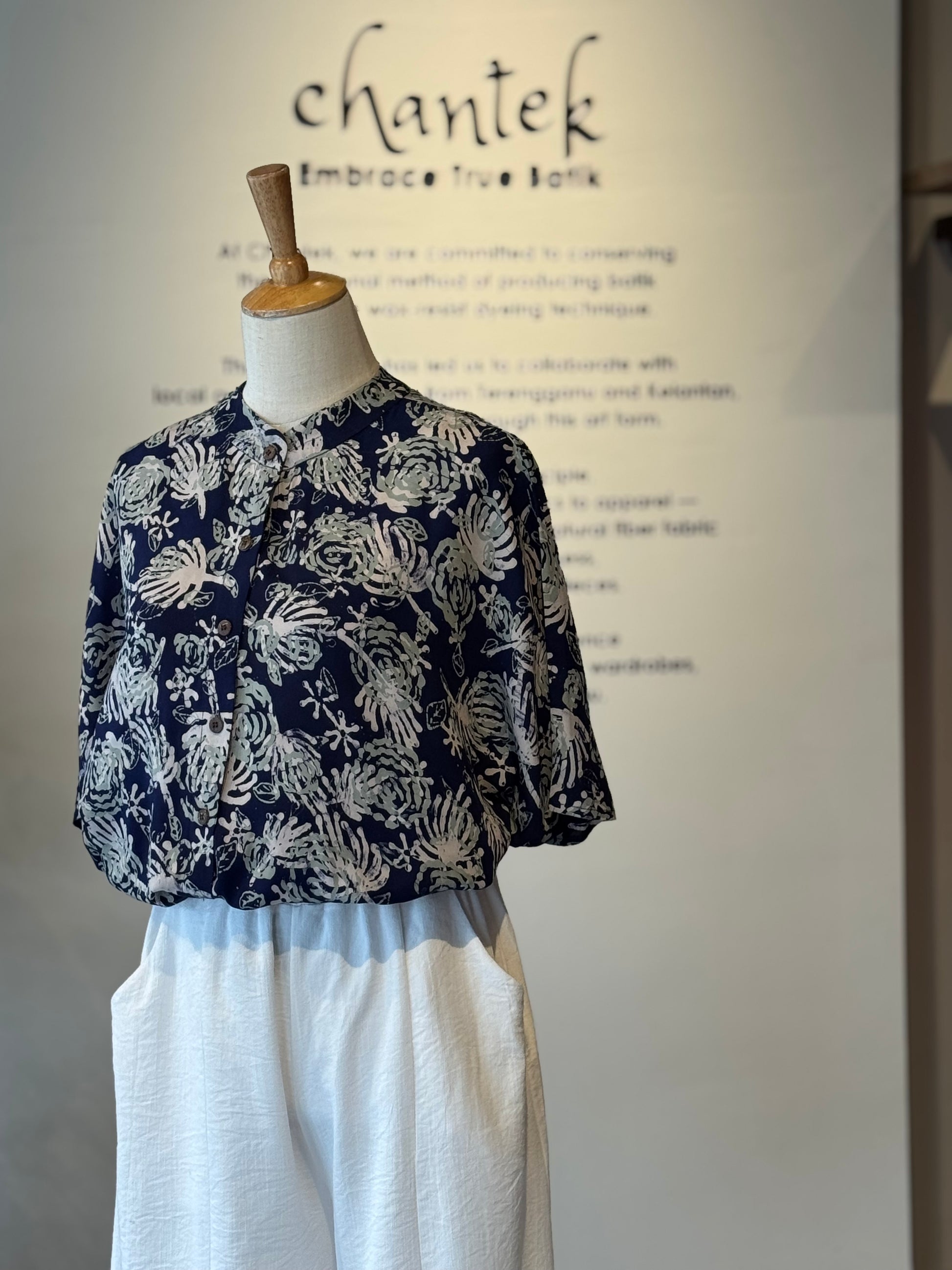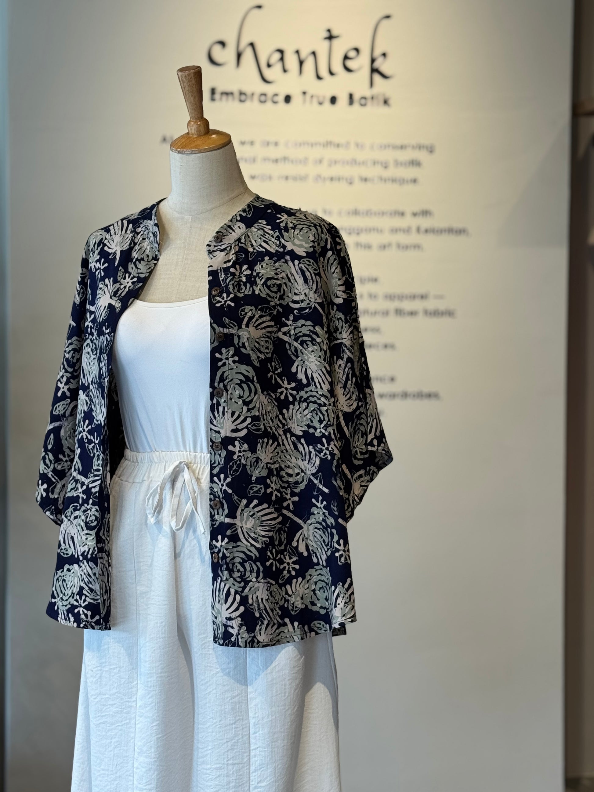 Transforming into a cardigan, the shirt takes on a new dimension. Leave it unbuttoned and wear it over a plain top or dress to add a layer of cultural charm. The batik patterns, now more visible, create an eye-catching ensemble that blends tradition with contemporary fashion.
