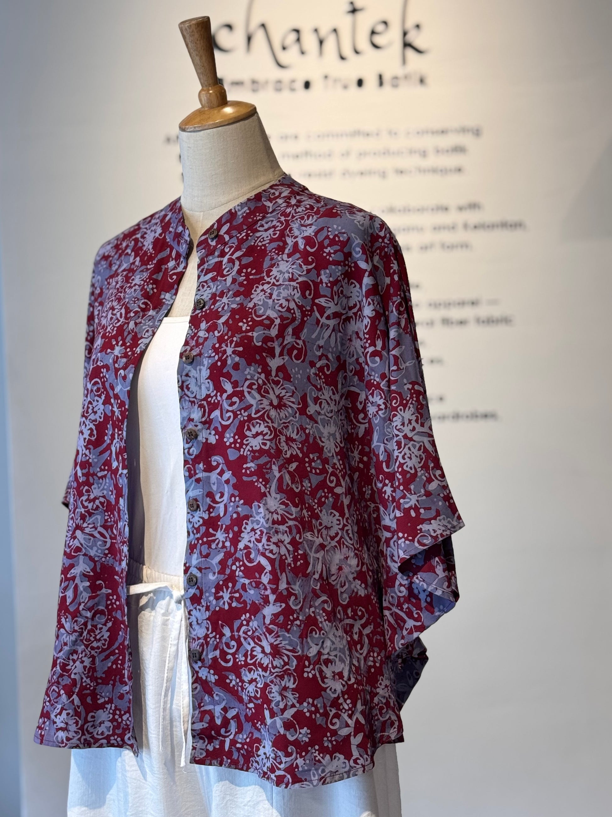 A cardigan shirt made from Kelantan handmade batik is a versatile piece that can be worn in multiple stylish ways.