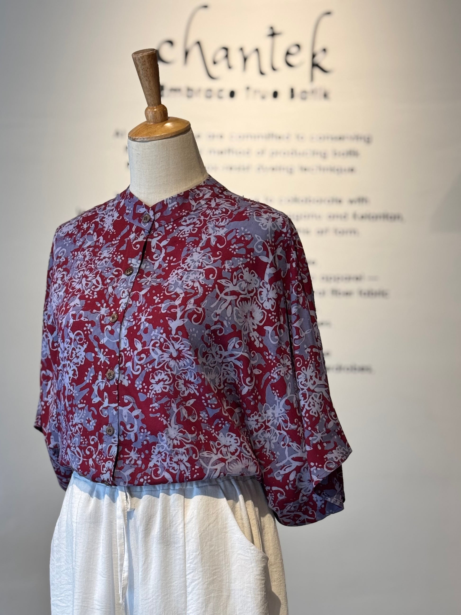 The shirt features a button-down front with delicate buttons that complement the rich hues and designs of the batik. The fabric itself is lightweight yet durable, making it perfect for various seasons and occasions.