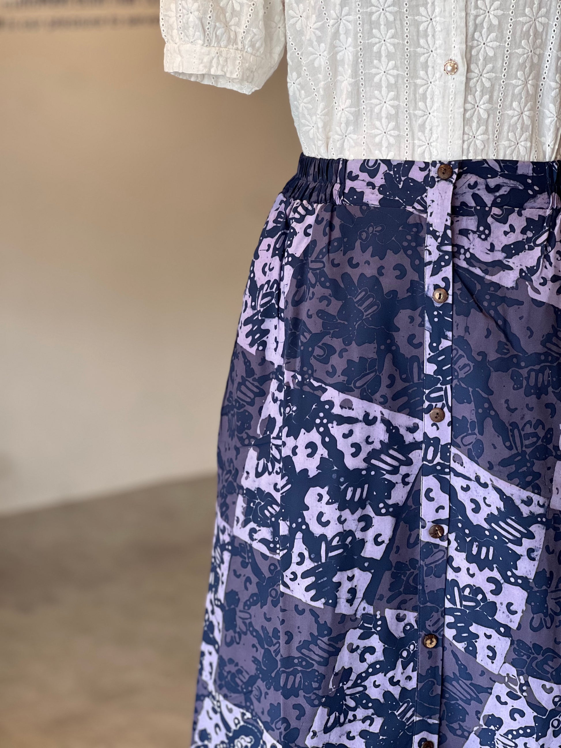 Flow into summer with the Emi Skirt, a breezy essential crafted from soft batik cotton viscose. Designed for comfort and movement, its wavy silhouette adds a playful touch to every step. Featuring a delicate batik floral pattern, this skirt blends tradition with effortless modern style.