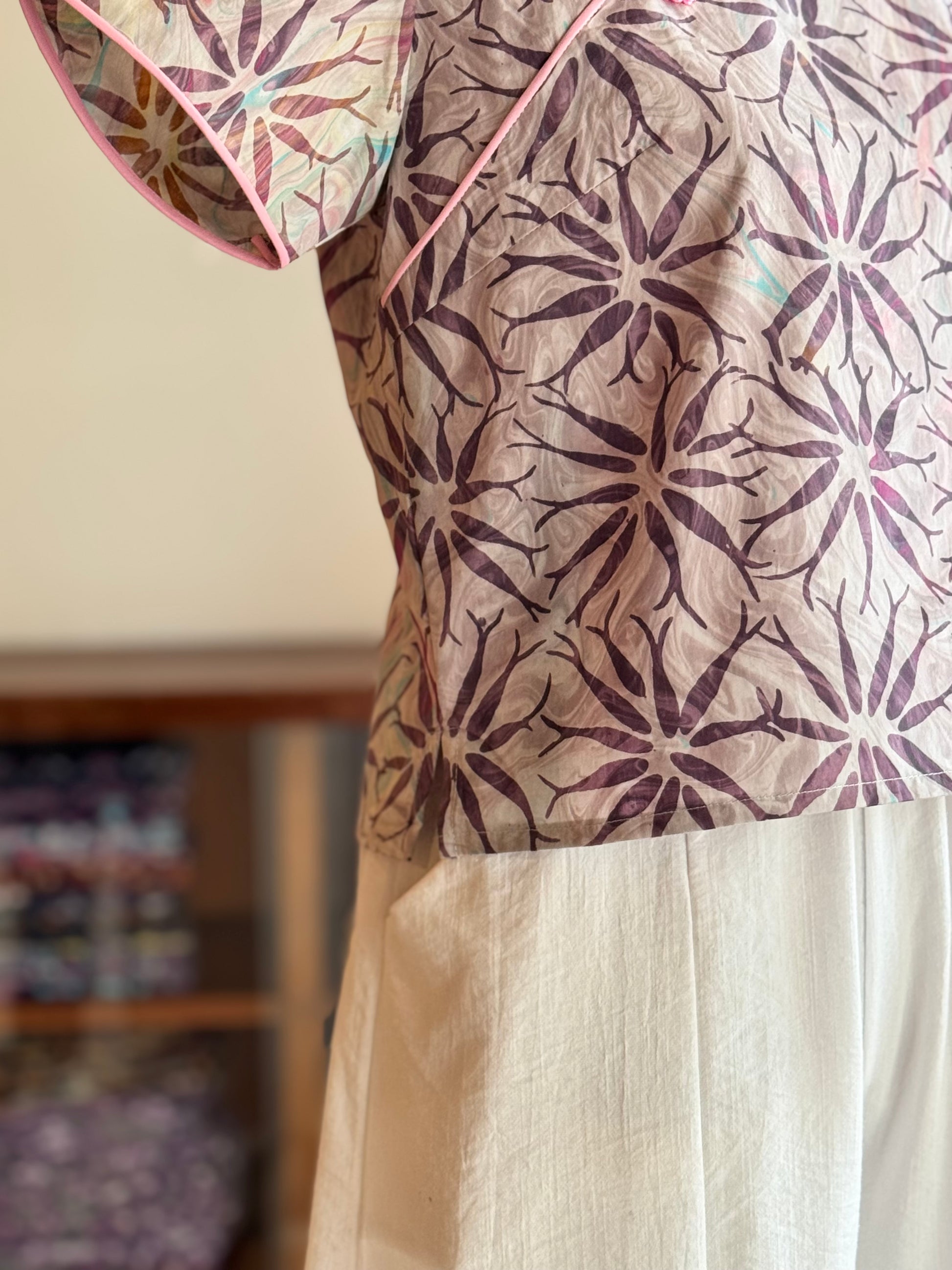 This Pastel Qipao Top is a perfect fusion of traditional elegance and modern style. Crafted from handmade batik fabric in Malaysia, it features soft pastel tones and delicate patterns for a fresh, easy-to-wear look. Comes with Chinese buttons along the top, adding a charming traditional detail. A versatile piece that effortlessly pairs with any outfit, capturing the essence of both classic and contemporary design, ideal for any occasion.