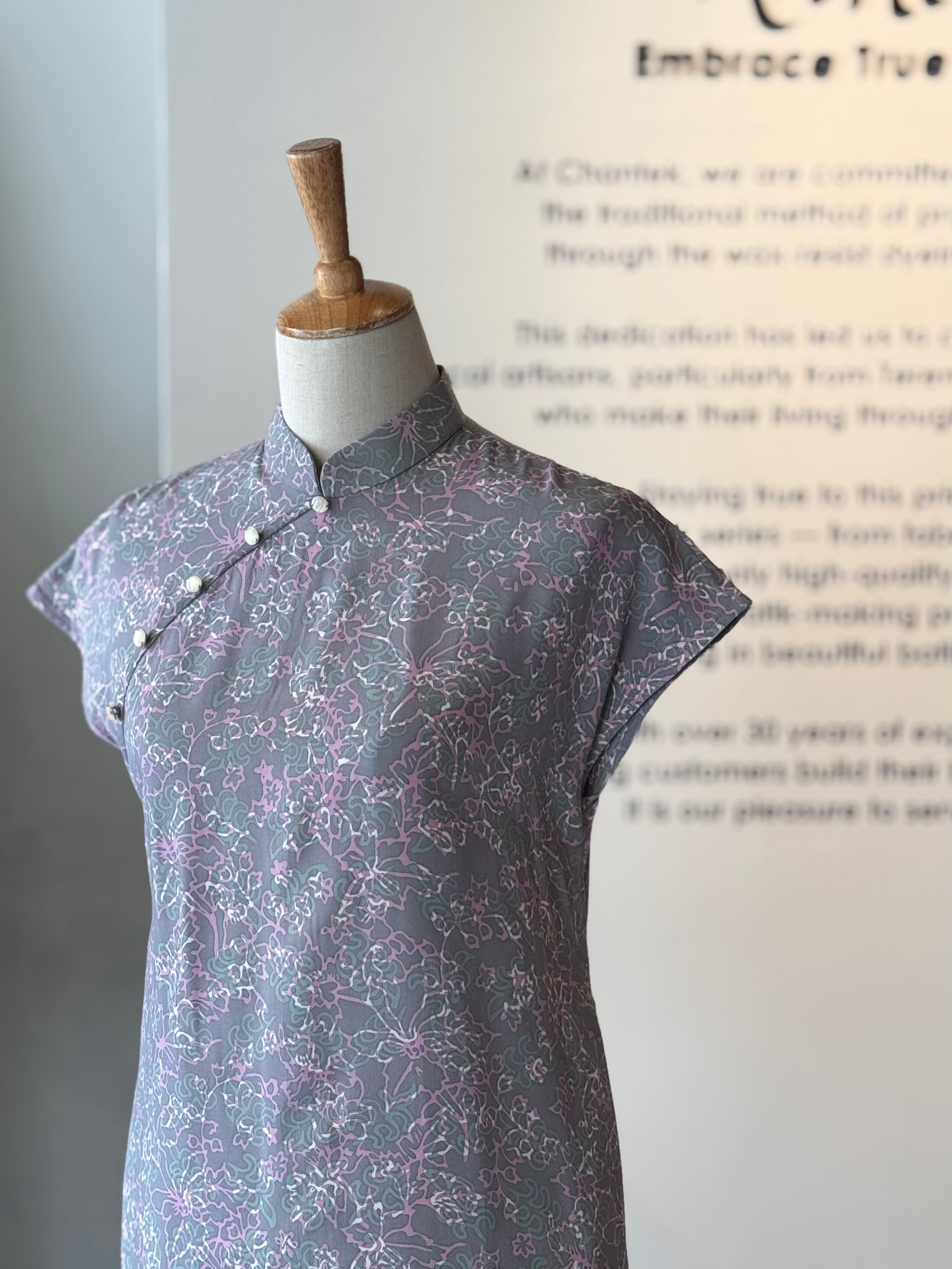 This qipao showcases a graceful cap-sleeve design that gently frames the shoulders, paired with a subtle flare silhouette that creates a soft, feminine flow.
