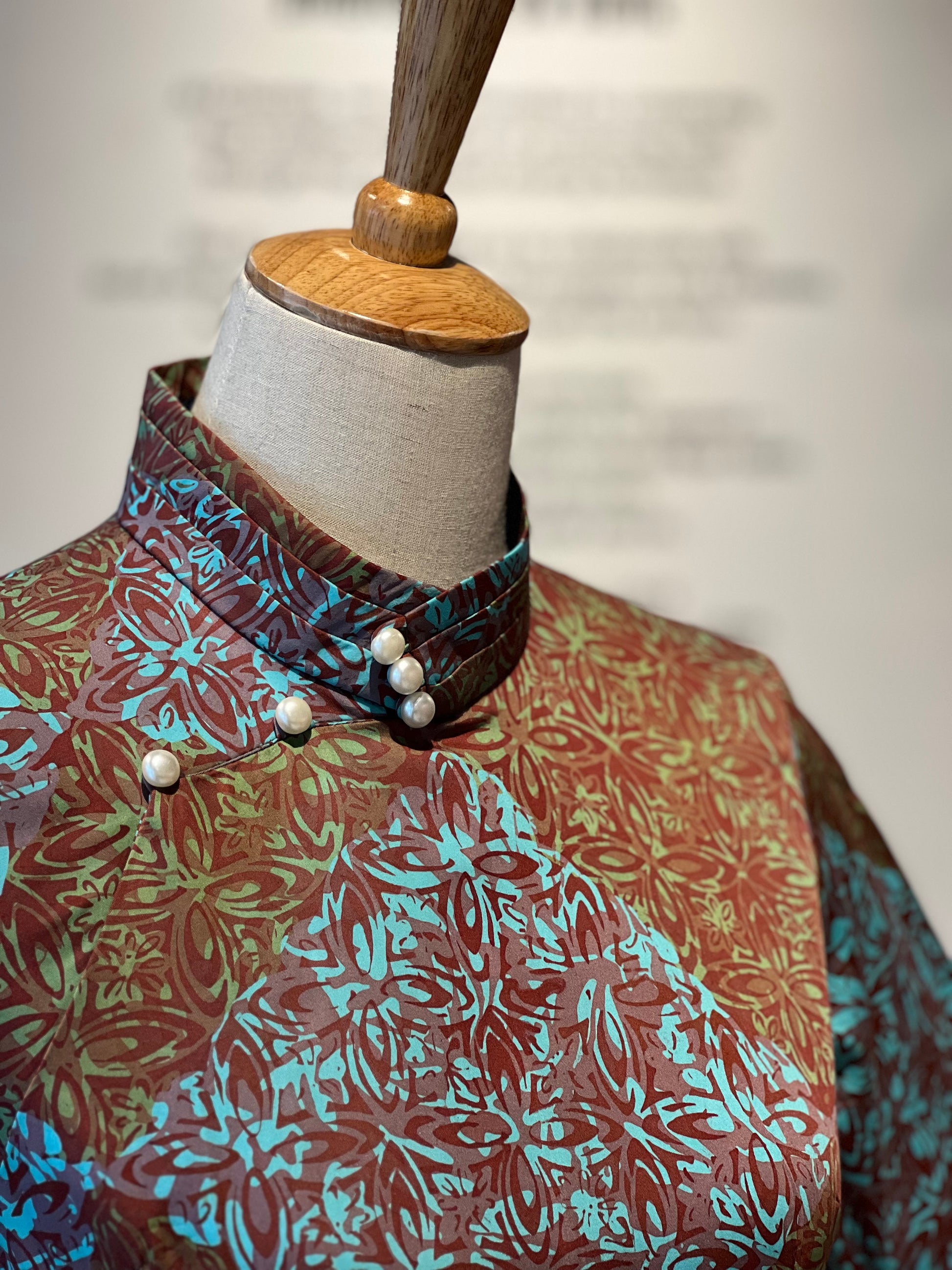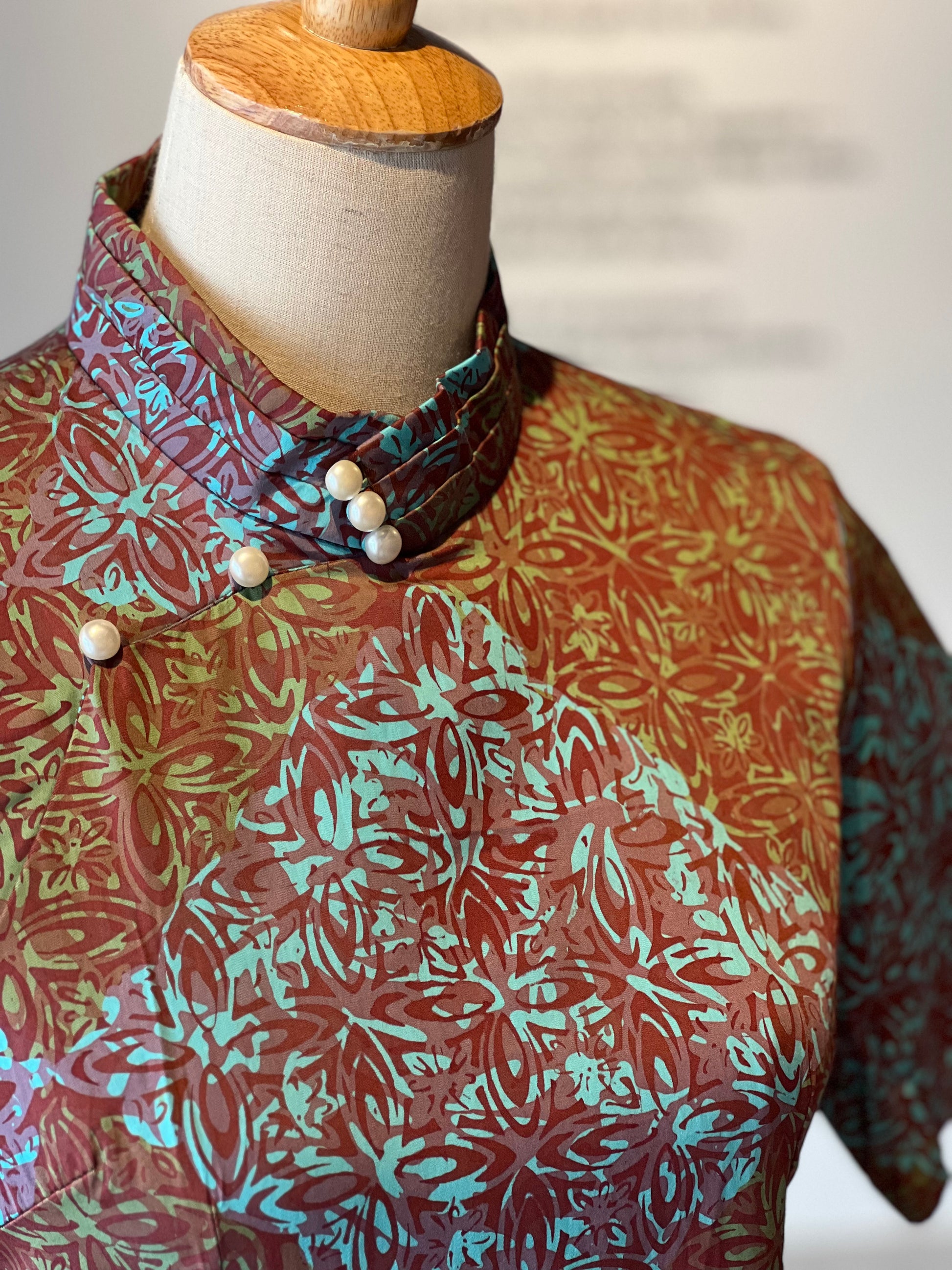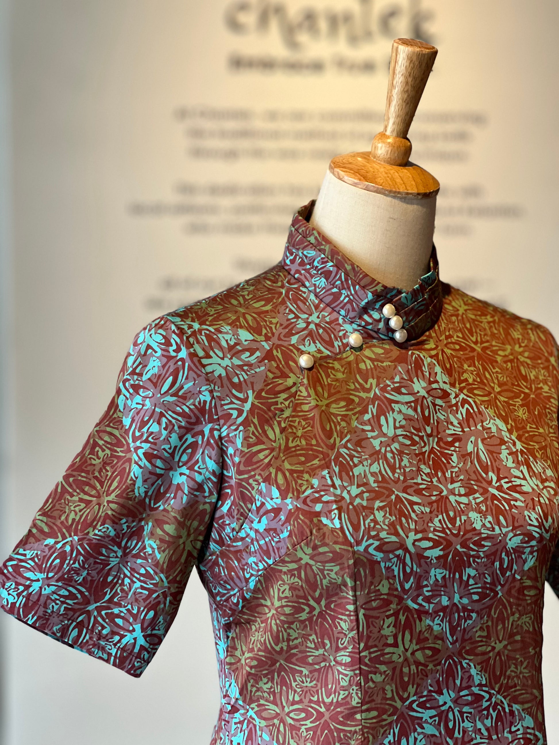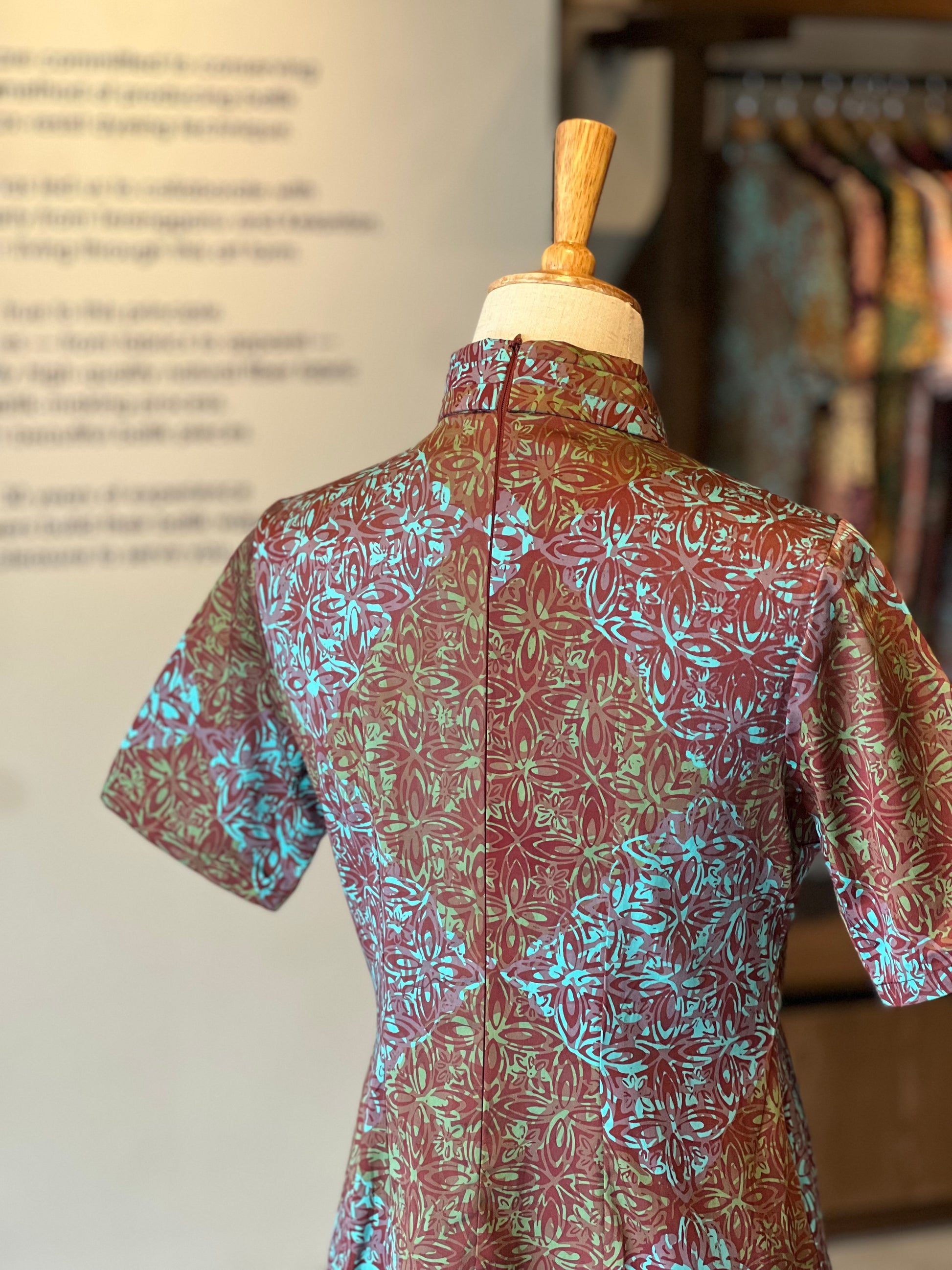 This elegant qipao dress specially design with sleeves is masterfully crafted through a meticulous hand-stamped batik process, where each motif is patiently layered with wax and dye to achieve its vibrant depth and texture.
