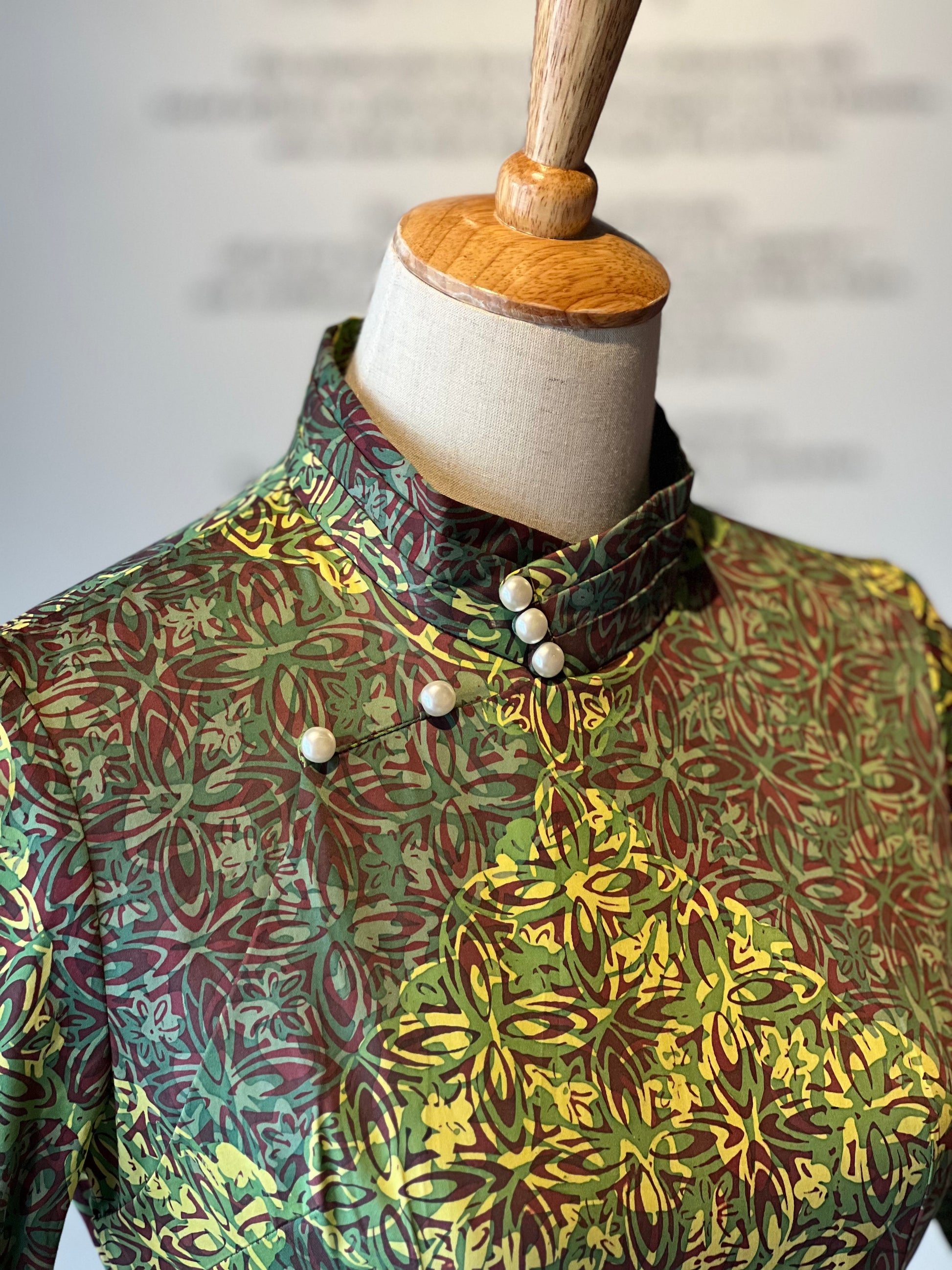 This elegant qipao dress specially design with sleeves is masterfully crafted through a meticulous hand-stamped batik process, where each motif is patiently layered with wax and dye to achieve its vibrant depth and texture.