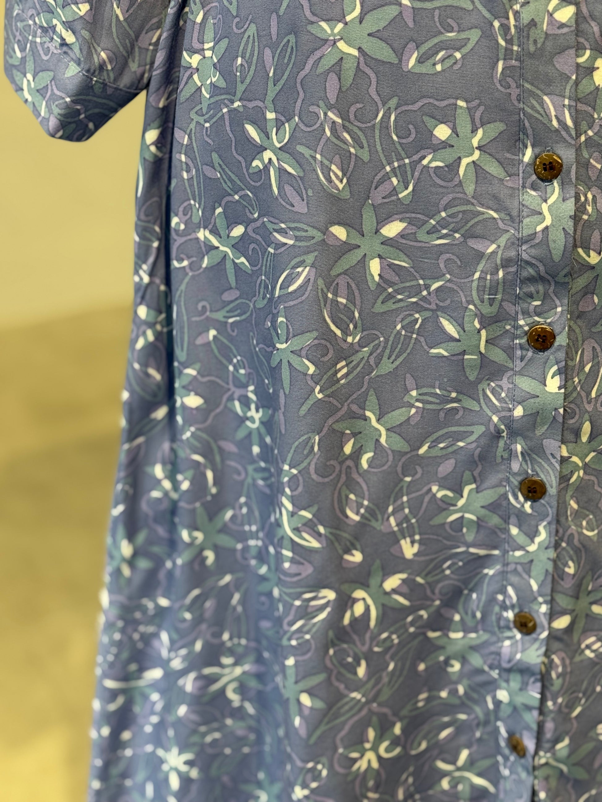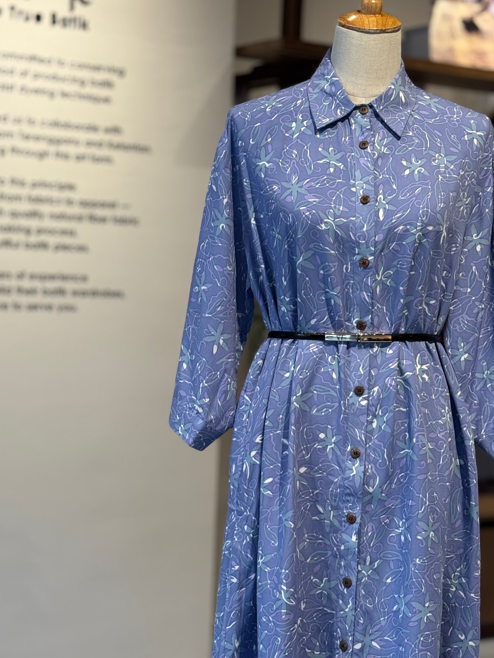 Made from beautiful Malaysia batik fabric, this dress features a classic shirt collar and a medium button-down front for a clean, timeless look.