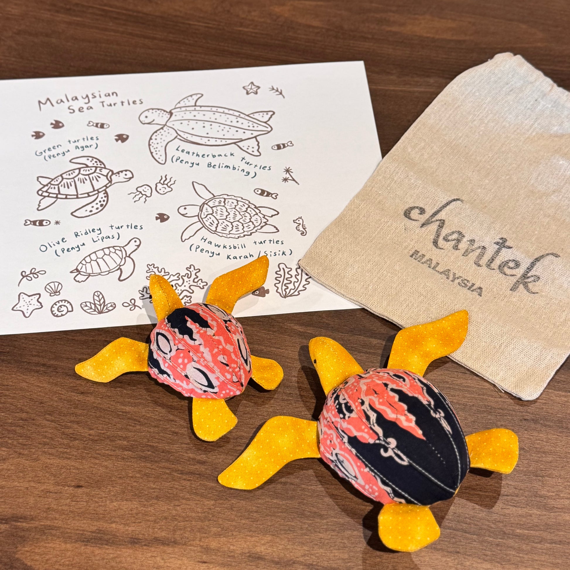 Toy set includes: 2 turtles (1 big and 1 small), a soft copy PDF of the sea turtle information colouring sheet, and 1 toy keepingÂ